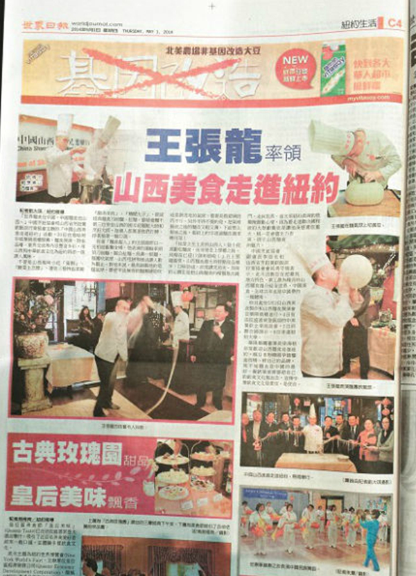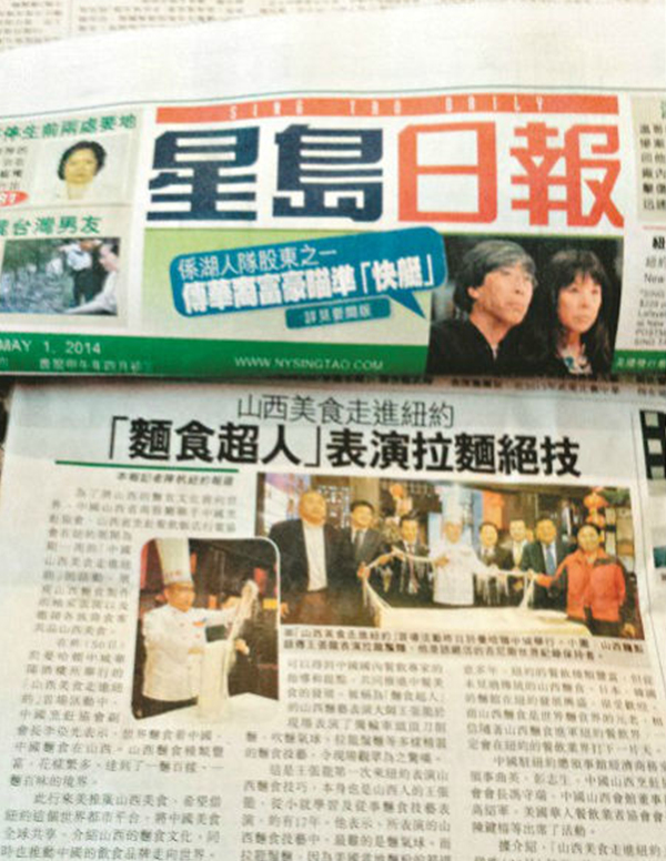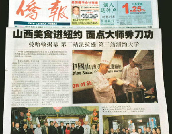 “中国·山西美食走进纽约”活动,引起美国新闻媒体的广泛关注。5月1日出版的《侨报》,运用半个版面,以《山西美食进纽约,面点大师秀刀功》为题,对“中国·山西美食走进纽约”活动进行了报道。《星岛日报》,《世界日报》《亚洲电视》、《美国中文电视》等也在5月1日、5月2日节目中,对“中国·山西美食走进纽约”活动进行了专题报道。