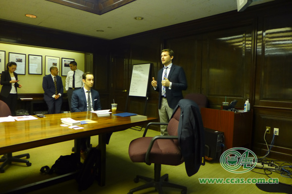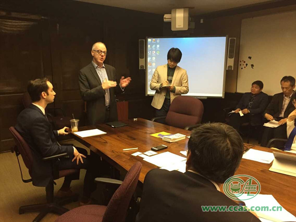在美国当地非常著名的Morimoto日餐厅的前总经理、耶鲁大学市场营销博士导师摩尔先生应邀来到现场,他根据多年对美国及东方餐饮市场的了解,分析了在纽约投资中餐的条件和对美国环境下的中餐的理解。他首先表示,在美国市场做中餐事业是一件非常困难的事情。他说:中餐在美国市场本土化很难,如果需要做强大,首先要把握当地的需求和寻找好的运营合作伙伴,并且要清楚的掌握客单价值和消费群体。他的学生,正在耶鲁大学读博士的北大毕业生赵勇先生,以他正在筹备的华尔街“君子时光”中餐厅为例,讲述了他对在纽约投资中餐的建议,他认为在纽约开办具有中国味道元素、适合美国大众消费的快餐品牌将具有巨大的发展空间。活动现场,面对专家们高屋建瓴的指导,代表团成员们细心聆听并多次报以热烈的掌声。