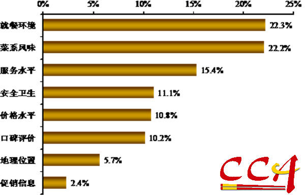 在餐厅的选择上,受访者看重的因素依次为:就餐环境、菜系风味、服务水平、安全卫生、价格水平、口碑评价、地理位置和促销信息(图1)。环境、口味与服务是餐饮产品的根本构成要素,此三项内容在调查中排在前三也体现出整个餐饮行业重新追本溯源,回归本质、回归市场的大趋势。