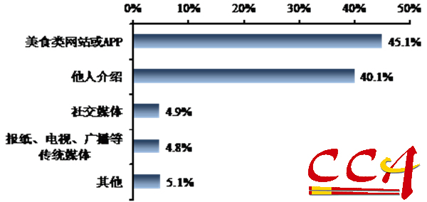 获取餐厅信息渠道的调查结果显示,“美食类网站或APP”以45.1%的占比排名第一,“他人介绍”占40.1%,“社交媒体”“报纸、电视、广播等传统媒体”和“其他渠道”合计占14.8%(图2)。