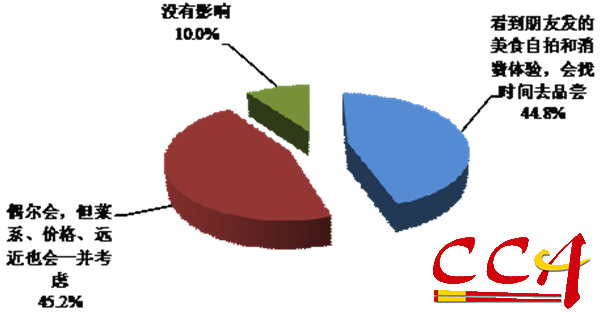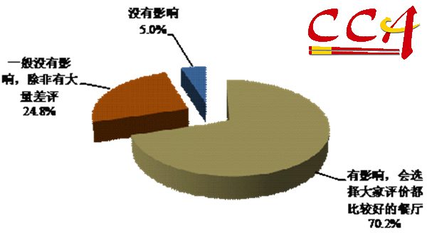 互联网时代,餐饮业最大特征便是餐饮企业的口碑传播被放大化。互联网是一面放大镜,它既会成倍提高优质餐饮品牌的知名度,同时也会加速淘汰那些诚信度较低的品牌,要想在开放的社交平台占据一席之地,口碑营销十分重要。有接近85%的受访者有在网络(点评类网站、朋友圈、微博)分享美食自拍、餐饮消费体验或发表评论的经验。反之,这些信息也极大程度地影响着消费者选择餐厅的行为,其中,近90%的人会受朋友在社交媒体的分享影响(图3),有超过70%的受访者会选择美食类点评网站上普遍好评的餐厅(图4),仅有5.0%的受访者表示他人的评价对其没有任何影响。