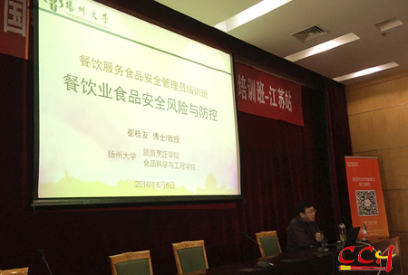 中国烹饪协会冯恩援副会长,江苏省食品药品监督管理局餐饮处姜玲主任、扬州大学食品科学与工程学院崔桂友教授分别从政府监管和行业自律等方面对食品安全法进行了多角度的解读。崔桂友教授运用多年从事餐饮食品教育的专业知识与把脉一线餐饮经验相结合,从生物性危害、化学性危害、物理性危害三方面解析餐饮食品中常见的危害因素,丰富的实际案例引导学员们认知餐饮企业尽可能避免日常工作中遇到的食品安全问题的重要性和可行性,防患于未然。