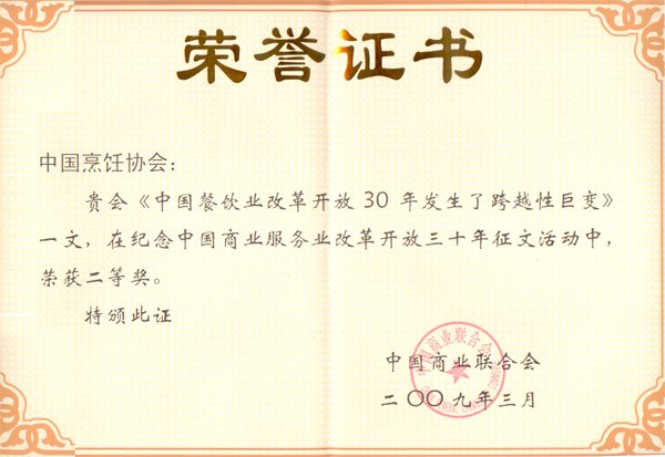 2008年是改革开放三十周年,为了更好地宣传、展示改革开放以来中国商业服务业创新发展的宝贵经验和伟大成就,中国商业联合会举办了纪念中国商业服务业改革开放三十周年征文活动。由我会行业发展部提供的稿件——《中国餐饮业改革开放30年发生了跨越性巨变》,在此次征文活动中荣获二等奖。 文章来源:行业部
