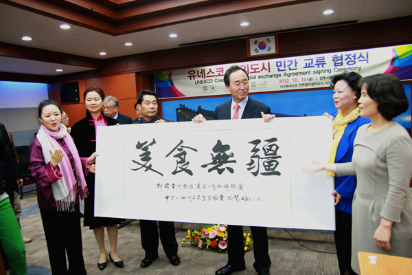 10月18日至20日,全球三大美食之都代表相聚韩国,出席在韩国全州举办的“全州拌饭节”活动及全州荣获联合国教科文组织颁发的“美食创意之都”庆典活动。10月19日,韩国全罗北道全州市市长宋河珍先生、哥伦比亚波帕扬美食机构荣誉主席吉耶尔莫·阿尔贝托·冈萨雷斯·莫斯格拉先生和四川省美食家协会副会长麦建玲女士分别代表全球三大美食之都共同签署了“美食联盟宣言”。旨在“和而不同”的原则下,相互学习、相互交流、共同促进烹饪技术和美食文化的提升和发展。四川省美食家协会美食品鉴团一行20人受邀参加了本次活动。