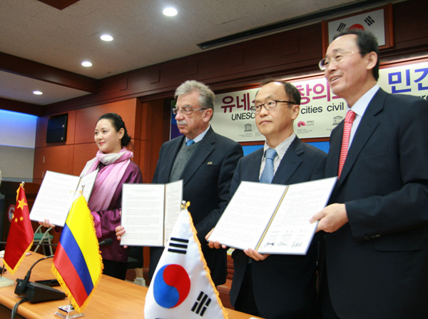 (从右至左)韩国全罗北道全州市市长宋河珍先生、韩国全州市“美食之都”申办代表宋在福教授、哥伦比亚波帕扬美食机构荣誉主席吉耶尔莫•阿尔贝托•冈萨雷斯•莫斯格拉先生和和四川省美食家协会副会长麦建玲女士分别代表全球三大美食之都共同签署了“美食联盟宣言”。