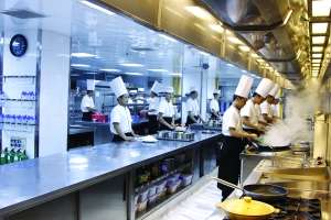 原料运到酒店,在进入厨房之前的验收严格遵守看、闻、称、分类盛装四个环节,对变质、不符合规格的,坚决退货。一种原料一个筐子,杜绝原料混放,择菜、洗菜也制定了专门的流程,在择菜间,还有专人手工择拣,清洗还要通过粗洗、淡盐水浸泡30分钟、清洗三道程序。