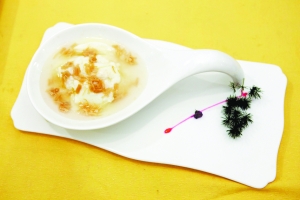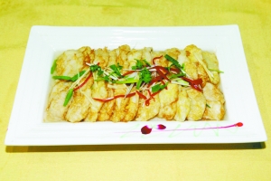 托蒸鱼片是宴会用菜,烹调技法独特复杂。把鱼片腌好,入热油煎至金黄色,放葱姜和少量清汤蒸熟,再用原汤兑好口味,浇在鱼片上即成。此菜色泽金黄,清淡鲜香,有健脑、明目、平喘的作用。