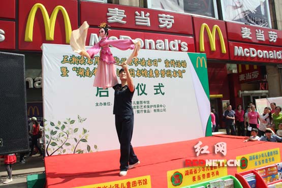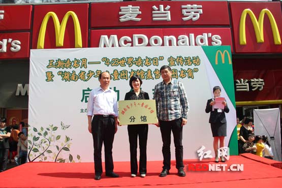 “三湘读书月——4·23世界读书日”宣传活动暨湖南省少年儿童图书馆“麦当劳图书角”启动仪式在长沙举行,湖南省文化厅向麦当劳颁发了湖南图书馆分馆牌匾。