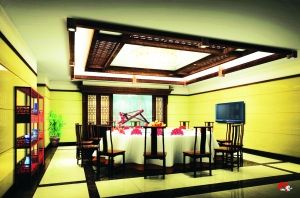 皇城老妈兰州店在建筑外立面的上部,采用汉砖《宴乐图》上的图画,形式沉稳,幅面显著,富有视觉冲击力,再现了古代蜀人宴饮娱乐的情景。店面金属与玻璃等工业化材料,结合石刻、漆器、石刻对联“川人川味,蜀地蜀风”、古建筑风格造型,呈现一种后现代手法,表现了蜀汉大气、厚重而平实的空间状态。入门通道均有木刻仿古木质挑顶,配合墙面木刻,形成一种古雅的氛围。一进入皇城坝大厅,便立即感受到四川天府之都的古风雅韵。一个巨大的蜀锦织机,由顶而降,强烈的视觉冲击使人不由地回到历史的华彩片段:古蜀以降品质高端的织锦、绣品,曾经出现在埃及法老木乃伊的头饰上、秦国时期皇公贵族的生活中。3楼有15个普通包间,注重商业性,4楼20个包间,除了各类普通包间外还有2个精美豪华包间,是经典章节的重复性再现。豪华包间均以不同的汉代纹样装饰,运用木材、石雕、金属板腐蚀、玻璃窗花等手段,再以蜀锦、织机、漆器等装饰品,展现四川蜀汉的蜀锦和漆器工艺的历史传承,营造出一种大气婉约、精美豪华又高雅的视觉空间效果,使人的思绪具有回溯的可能性,将四川地域的历史文化符号凸现了出来。