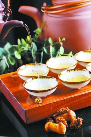 如汤品“高山流水遇知音”,集羊肚菌、竹笋、黑松露这些菌中极品而成,能有效地增强抵抗力,改善人体的免疫系统,此汤汤色幽黄清澈,口感鲜爽,菌香浓郁。再如“茶油虫草花”,虫草花是人工培养的虫草子实体,具有独特的草菇般香味,不寒不燥,且含有丰富的蛋白质、氨基酸以及虫草素、甘露醇、SOD、多糖类等成分,吴裕泰内府菜将虫草花以茶油相佐,使茶油与虫草花的营养互为补充,更添异香风味。