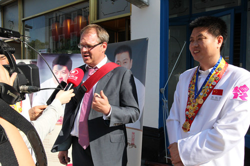 凤凰卫视欧洲台采访了中国烹饪大师、阿五品牌创始人樊胜武,他说:“此次豫菜餐饮企业抱团来到英国交流厨艺,旨在宣传豫菜,让更多的人了解中国饮食文化,提升中华美食的知名度,还要吸取英国优秀的餐饮经验,在自己的企业中不断改良创新,推动豫菜的发展。记得2008年我第一次赴阿联酋迪拜参加世界厨师联合大会,独自一人,深感力量的单薄;近年来,我们组织了很多让豫菜站起来、走出去的活动,比如2010年的澳门美食节、2011年的马来西亚美食嘉年华、2012年在韩国举办的第35届世界厨师联合大会等活动,一次比一次更有信心、更有力量,因为我看到了身边多了很多有志之士加入进来,形成合力,这种力量是无穷的。也希望政府和相关部门能积极的联系和组织国内外的餐饮推介活动,把河南美食推向世界,拉长餐饮产业链,造福更多人。”