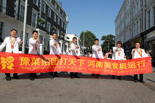7月18日——29日,由大河报、河南省餐饮与饭店行业协会主办,宋河酒业股份有限公司、阿五美食、龙祥宾馆、鲁班张国宴、和会馆、煜丰美食、味道名家、成师傅大长垣等共同协办的“豫菜抱团打天下,河南美食奥运行”系列活动在英伦三岛上演。这是“豫菜抱团打天下”继2010年河南美食澳门行、2011年马来西亚美食嘉年华、2012豫菜四大天王集结亮相世厨联之后的第四次系列活动。