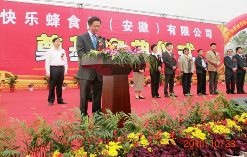政府重视,社会支持。2010年7月27日,安徽省舒城县委副书记、县长金德元代表县人民政府与快乐蜂餐饮集团在上海签订合约,合约内容为:快乐蜂餐饮集团将在舒城县经济开发区投资建设中央食品加工厂。在舒城县委、县政府的关怀支持下,有县经济开发区及各主管部门的帮助下,2010年10月23日,快乐蜂食品(安徽)有限公司奠基,经过几个月的紧张有序筹备,近日顺利投产。