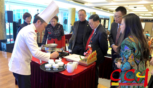 中国烹饪大师郭文俊为来宾们展示了古典名著《红楼梦》里的经典菜式——雪底芹芽的制作过程,伴随着《红楼梦》清缓悠扬的音乐,用中国厨艺制作的蛋白上摆放着嫩绿的芹菜芽和炒熟的鹌鹑肉丝,配以精美的器皿,呈现在来宾面前,带来的是美好的心灵享受。烹饪大师秦良余现场表演了安徽省非物质文化遗产“银丝饼”,当他把根根细如发丝的面丝穿过缝衣针时,来宾们直呼不敢相信自己的眼睛。