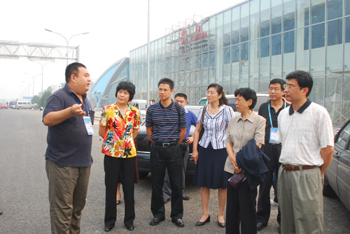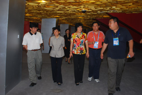 张玉藏常务副书记(左三)和杨柳常务副会长(左二)等考察奥运媒体中心