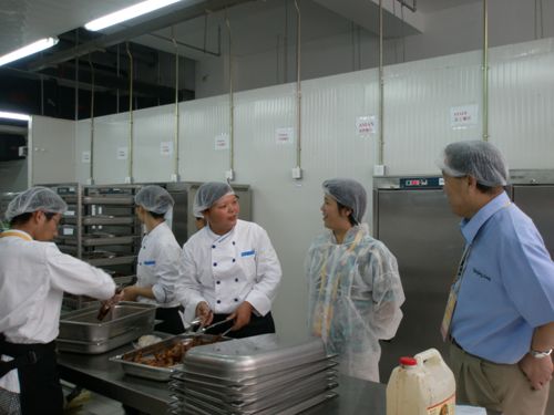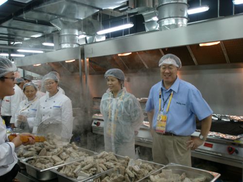 在AV和MV1,杨会长参观了场馆餐厅和师生所工作的厨房,并亲切的与在岗学生交谈,了解学生在场馆工作情况,以及饮食等情况,送去了协会上下对广大涉奥师生的关怀之情。在厨房观看了学生使用现代化的厨房设备为各国奥运健儿和媒体工作者烹制佳肴的过程,并与广大师生合影。