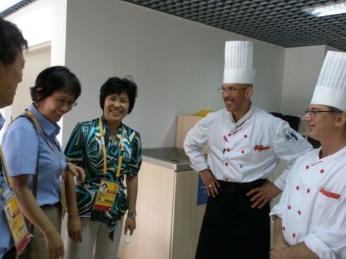 8月1日,中国烹饪协会常务会副会长、中国烹饪协会奥运项目临时团委书记杨柳女士在爱玛客人事总监科斯汀、赵金林教授的陪同下前往奥运场馆慰问为奥运无私奉献的奥运餐饮工作人员。此次奥运会,中国烹饪协会为爱玛客从全国23所高校招聘了1762名餐饮工作人员,并代为管理600余名服务人员,所有人员现分布在AV(奥运村)、IBC(国际广播中心)、MPC(主新闻中心)、MV1(媒体1村-绿色家园)和MV2(媒体2寸-汇源公寓)这五大场馆工作。