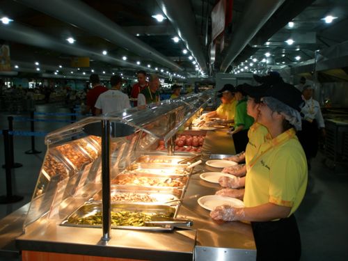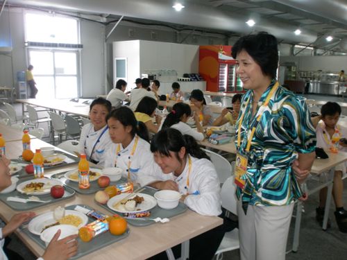 在奥运场馆中,杨会长首先查看了奥运工作人员餐厅,了解师生在场馆的伙食情况,并与就餐中的师生亲切交谈。她高度评价广大师生不怕辛苦、不辞劳累,肯定他们为奥运做贡献的精神,同时勉励大家继续为各国奥运健儿和媒体工作者奉献最精美、可口的饭菜。