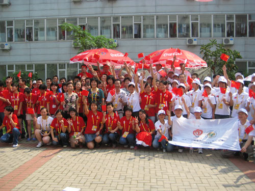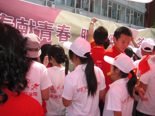 最后,杨柳会长和全体师生共同唱起了《北京欢迎你》,并在“奉献青春、服务奥运”条幅上签下自己的名字和誓言。