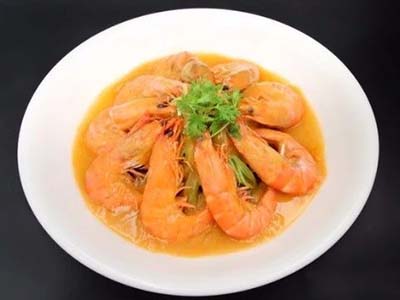 原料:对虾、潍县萝卜 配料:葱花、姜丝、料酒、胡椒粉、香菜末