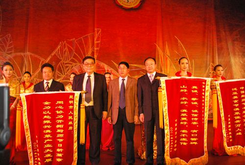 苏秋成会长代表中国厨师节组委会向云南省商务厅、昆明市人民政府和云南省餐饮与美食行业协会分别赠送锦旗