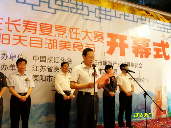 5月17日,由中国烹饪协会、溧阳市旅游产业指导委员会主办,江苏省烹饪协会、溧阳市旅游局承办,溧阳市金峰国际饭店、常州长荡湖酒业有限公司协办的2012中国养生长寿宴烹饪大赛暨第八届天目湖美食节在江苏省溧阳市隆重开幕。中国烹饪协会李亚光副会长出席开幕式并专门为本次的参赛代表做了“2011年餐饮业发展回顾与2012前景展望”的专题讲座。
