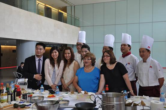 泰国驻华公使夫人Aroonwan Chuwiruch、秘鲁驻华大使馆公使衔参赞Mercedes Gil Juscamaita及随行与餐饮美食体验馆厨师合影留念