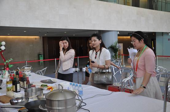 30日上午,泰国驻华大使馆公使夫人Aroonwan Chuwiruch、秘鲁驻华大使馆公使衔参赞Mercedes Gil Juscamaita一行来到餐饮美食体验馆,参加了当日的国际交流活动,现场学习锅贴、粽子、豉汁蒸扇贝等中式菜肴,并在美食体验区品尝了双皮奶、赖汤圆、扬州炒饭等特色风味小吃。