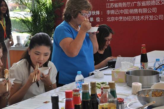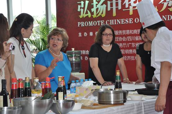 泰国驻华公使夫人Aroonwan Chuwiruch、秘鲁驻华大使馆公使衔参赞Mercedes Gil Juscamaita现场品尝中餐美食
