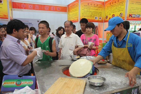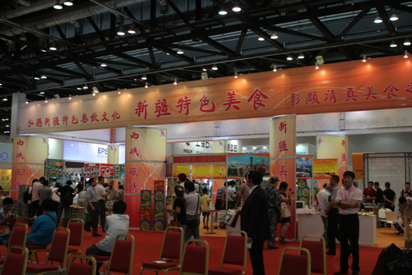 为了全面展现新疆特色餐饮,本次2012国际餐饮博览会现场,新疆自治区商务厅专门组织了新疆火宴山餐饮有限公司、乌鲁木齐博盾工贸有限公司、江南王子饭店、新疆西尔丹食品有限公司、胖老汉清真餐饮连锁机构、新疆阿布拉的馕连锁有限公司、新疆海尔巴格商贸有限公司、热合买提公司、阿尔曼、别迭里、湘鹅庄、苏氏企业发展有限公司等12家知名的餐饮企业参展。