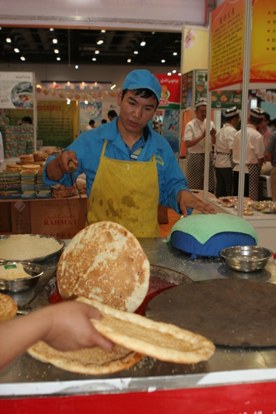 此外,热合买提公司专程从新疆带来100个馕,将近30个品种。阿布拉的馕在展会上摆了2台环保馕坑,现场烤制馕。博盾公司展示了特色产品烤包子,并在现场制作抓饭。阿尔曼企业在展柜上摆有特色清真食品,如:糕点,包装食品等。