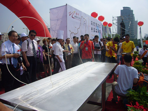 百米一根面、骑独轮车头顶刀削面、高跷呼啦圈剪刀面、六十米一根萝卜丝、糖艺造型表演和金丝骆驼等中华名厨绝技绝活的精彩表演,精彩绝伦、美不胜收。