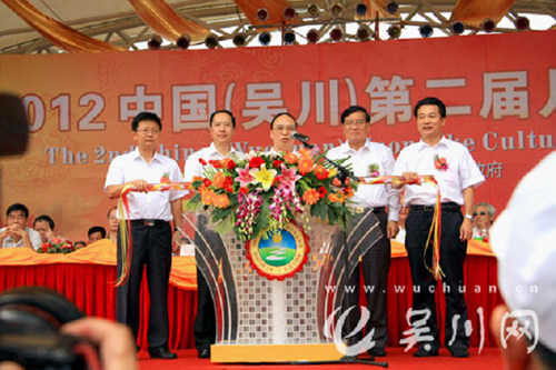 中国烹饪协会副会长李亚光与湛江市委书记刘小华,市委常委陈岸明、吴川市市委书记曹兴、市长江毅共同启动“2012中国(吴川)第二届月饼文化节”。