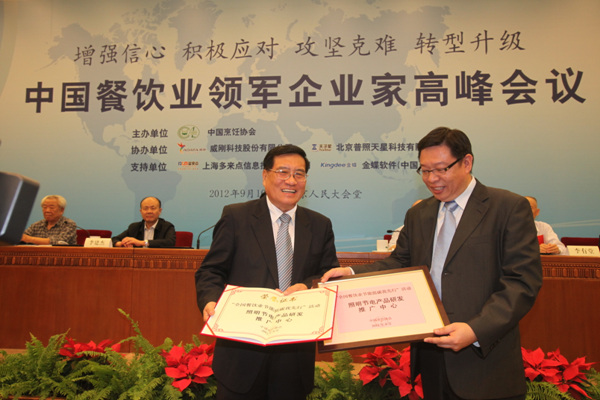 中国烹饪协会李亚光副会长为威刚集团颁发“全国餐饮业节能低碳我先行”照明节电产品研发推广中心牌匾