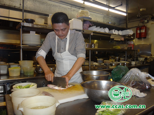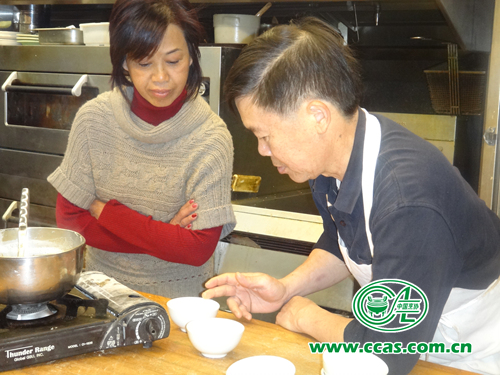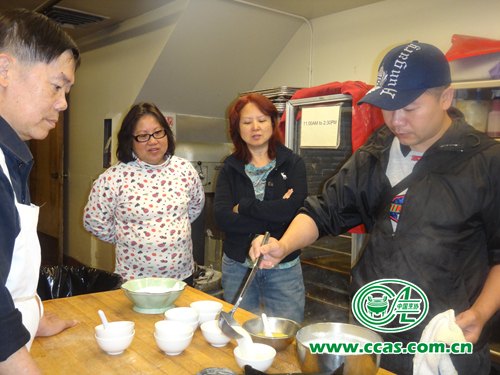 在丽宝楼,访问团的几位大师们亲自下厨,分别制作了七彩鱼茸羹、红豆薄撑、桂花瑶柱、姜撞奶等有代表性的粤菜菜肴,几位食还客迫不及待的跑到后厨目睹大师们的制作过程,品尝后大赞味道纯正。丽宝楼的厨师更是受益颇多,一边观看大师们的制作,还一边认真的记录,他们表示,这次学习的机会实在太难得,同样的菜式店里也有,但是味道上就会差很多,现在了解到大师们的制作秘诀,加上自己的认真研究,相信今后的出品一定会更加地道,店里的食客也将大饱口福。厨师们还表示,这次祖国能派出这么好的团队来指导海外中餐馆的厨师技艺,自己更加充满信心,相信中餐在海外会越做越好,也希望中国烹饪协会今后能多多组织这样的交流学习机会,同时,厨师们也为访问团几位大师毫无保留的无私传授所感动,盛赞大师们不仅带来了技术,更是浓浓的乡情和记忆中家的味道。