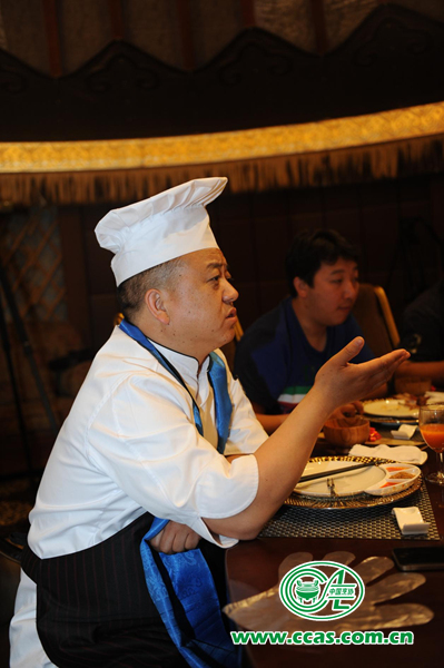 “九十九顶毡房”餐厅行政总厨杨玉平向代表团介绍菜品设计