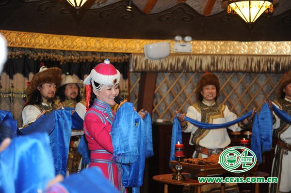 代表团采访设在蒙古包里的蒙古族特色宴席