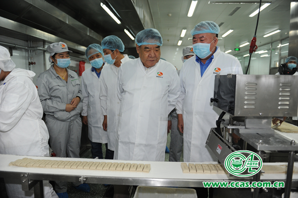 苏秋成会长考察华天饮食集团配送中心生产线,朱玉岭董事长(右一)介绍相关情况