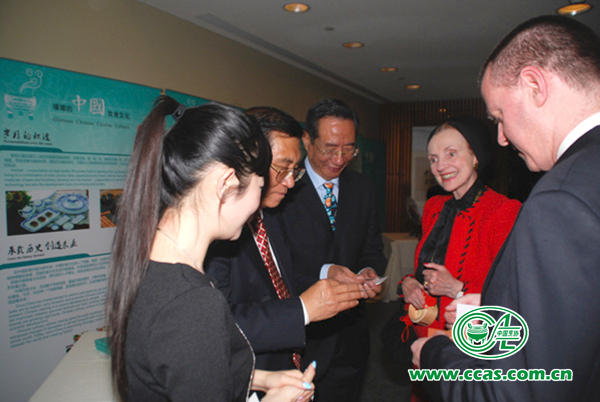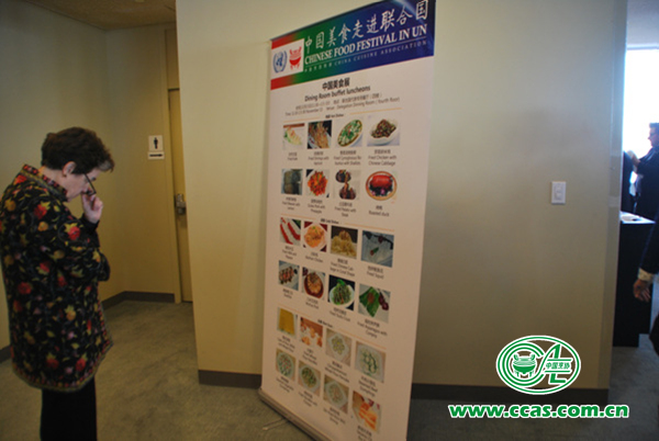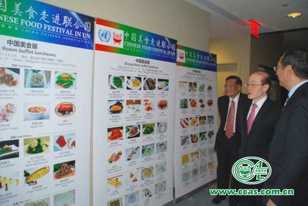 刘结一大使在冯恩援、李亚光两位团长的陪同下参观中国美食走进联合国活动展板