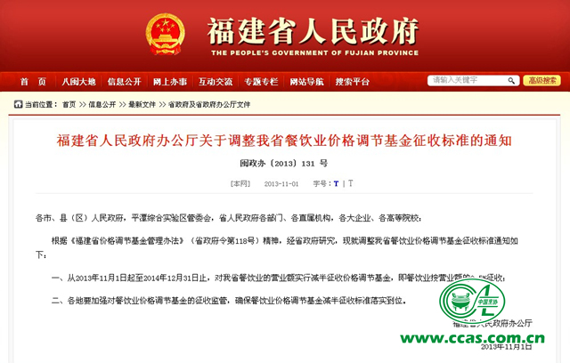 近日,福建省人民政府办公厅下发了《关于调整我省餐饮业价格调节基金征收标准的通知》(闽政办〔2013〕131 号),要求从2013年11月1日起至2014年12月31日,对福建省餐饮业的营业额实行减半征收价格调节基金,即餐饮业按营业额的0.5%征收。这是继今年2月餐饮类的银行卡刷卡费率下调至1.25%之后,餐饮行业在清税减费方面取得的又一重大突破,是行业发展软环境得以优化的又一重要里程碑。