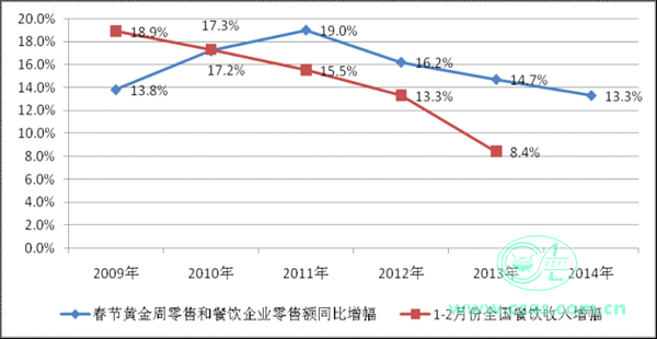 图2.2009-2014年春节零售餐饮增幅与同期1-2月餐饮收入增幅对比