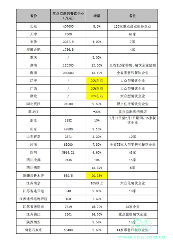 从各地商务部门公布的监测数据来看,监测的大众化餐饮企业在春节黄金周期间的增幅普遍在15%以上,而包括中高端餐饮企业的监测数据平均增幅在10%左右。具体数据见表1。