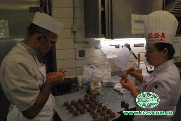 中国厨师(面点师)在试做过程中教授巴黎咖啡厅厨师制作独具风格的中国面点小吃