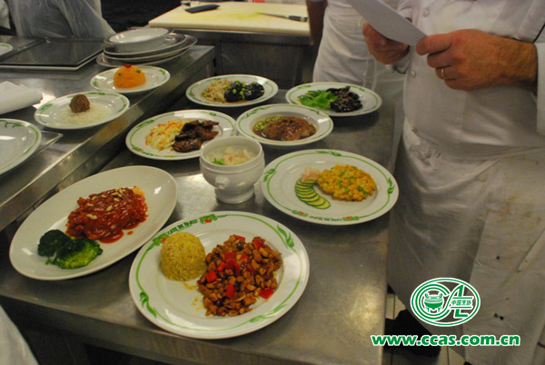 2月11日上午,中国美食代表团厨师身着整齐的厨师服,现身巴黎咖啡厅,开始试做菜肴。他们精湛独特的烹饪技艺赢得了外方厨师的高度赞扬。经过一上午的辛勤劳动,一款款色泽鲜润、香味扑鼻、味道纯正、外观精美的中式菜肴展现在欧洲名厨们面前,引得他们纷纷拍照品尝,赞叹不已。