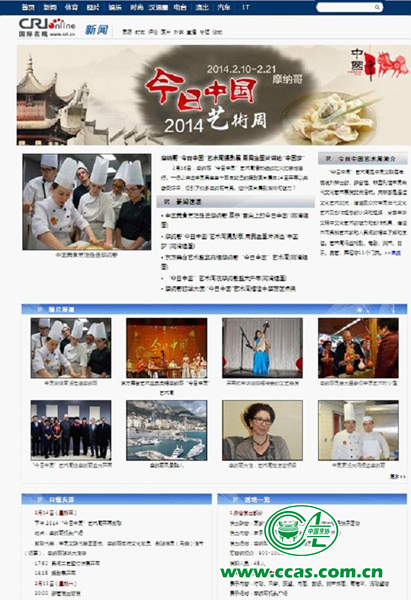 中国国际广播电台网站新闻首页大篇幅报道“今日中国”艺术周活动,上面关于中国美食展演活动的报道占据头条,关于大厨的图片占据了最大的比重