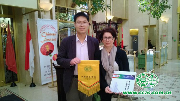 摩纳哥驻华大使凯瑟琳·福特里埃接受中国美食展演团领队赠送的中国烹饪协会会旗