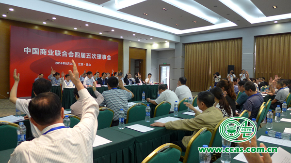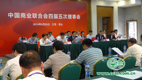 姜明常务副会长做了《中国商业联合会第四届五次理事会工作报告》,汇报了四届四次理事会以来,包括深入学习贯彻党的十八大和十八届三中全会精神,认真开展党的群众路线教育实践活动,开创科学发展新局面;深入调查研究,提出政策建议,服务流通业全局;改革创新,培育品牌,打造重点业务活动;发挥联合优势,服务会员单位,促进行业持续发展;加强对外和台港澳交流,为商贸流通业“引进来”和“走出去”服务;科学管理,规范运行,提高服务能力和工作水平等六个方面的工作。