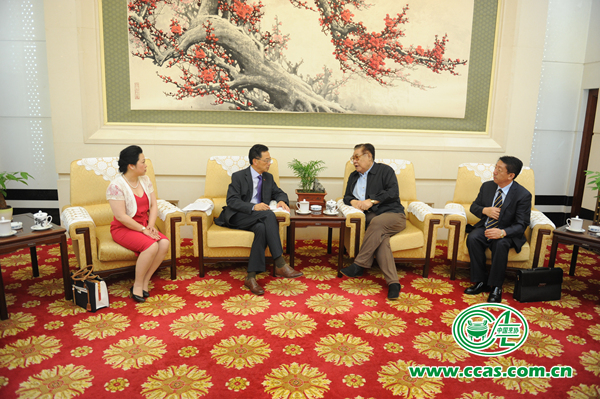 中国烹饪协会苏秋成会长在人民大会堂与全英华人外卖公会陈德樑会长就中餐“走出去”问题进行深入会谈