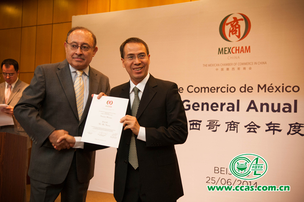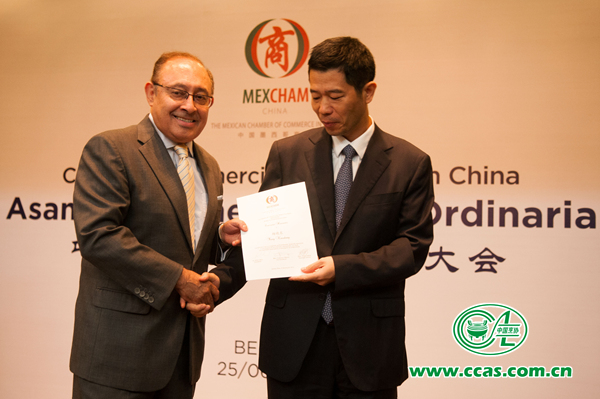 中国墨西哥商会主席艾夫仁·卡尔沃向中国国际贸易促进委员会贸易推广交流中心主任杨晓东颁发名誉顾问证书
