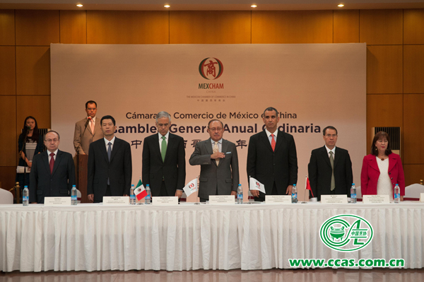 中国墨西哥商会主席艾夫仁·卡尔沃在大会上发表了热情洋溢的欢迎致辞,他回顾了中国墨西哥商会在促进墨中贸易发展方面所做的贡献,并提出了下一年的战略发展,表示中国墨西哥商会是代表所有墨西哥常驻中国的企业与商贸的非赢利组织,一直并将不断致力于促进墨西哥与中国的经贸发展。致辞后,卡尔沃主席向受聘成为中国墨西哥商会名誉顾问、一直致力于促进墨中贸易发展的专业人士颁发了荣誉顾问证书。墨西哥驻华大使胡利安·本图拉、中国国际贸易促进委员会贸易推广交流中心主任杨晓东、中国经济联络中心副主任吴保才等先后在大会上致辞,就如何促进中墨贸易发展发表了建设性的意见。